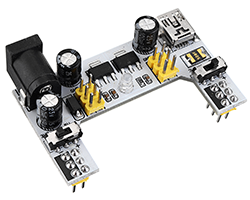 ASM1117を搭載したDC-DC降圧型電源モジュール、ブレッドボードMB-102対応、入力電圧範囲:2通り、(1)DCジャック、φ2.1/5.5、6.5〜12V、(2)メスMINI USBコネクタ、5V、出力電圧:3.3V/5.0V、出力電流:MAX 1.5A、基板寸法:53x35mm、表記価格:1