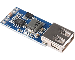 MP1583を搭載した5V固定電圧出力DC-DC昇圧モジュール、入力電圧範囲:7.5〜28V、出力電圧:5V、出力電流:MAX 3A(推奨:<2A)、出力接続:TYPE-AメスUSBコネクタx2基、変換効率:MAX 96%、基板寸法:42x16mm、表記価格:1