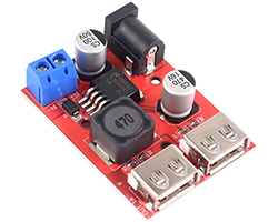 LM2596を搭載したDC-DC降圧型電源モジュール、入力電圧範囲:6〜40V、出力電圧:5V、TYPE-AメスUSBコネクタx2基、出力電流:MAX 3A、動作周波数:150KHz、電力変換効率:MAX 92%、基板寸法:50x31mm、表記価格:1