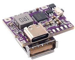 IP5310 を搭載した充放電基板、入力電圧範囲:4.2〜6.5V、充電電流:3A、充電終了電圧:4.2V、変換効率:MAX 93%、基板寸法:26x19mm、表記価格:1