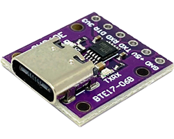 CH340Eを搭載したUSBシリアルコンバータ、USB側:TYPE-C USBメスコネクタ、シリアル側:TTLレベル、2.54mmピッチ6Pスルーホール、ピンアサイン:GND、+5V、TXD、RXD、DTR、+3.3V、基板寸法:18x16.1mm、表記価格:1