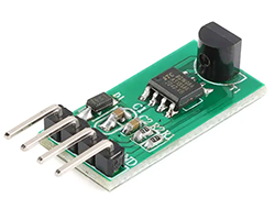 18B20を搭載した温度センサモジュール、シリアルインターフェース、ボーレート:9600bps、温度レンジ:-55 〜+ 125°C、分解能:0.5°C、動作電圧範囲:3.3〜5V、基板寸法:24 x 11 mm、表記価格:1