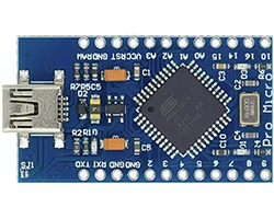 公式回路ベースのアルデュイーノ互換機Pro Micro、Atmega32U4 16MHz 5V、MINI USBメスコネクタ、基板寸法:32.5 x 17.5 mm、表記価格:1