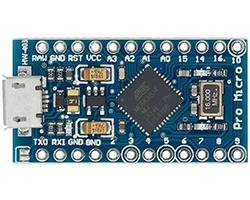 公式回路ベースのアルデュイーノ互換機Pro Micro、Atmega32U4 16MHz 5V、マイクロUSBメスコネクタ、基板寸法:32.5 x 17.5 mm、表記価格:1