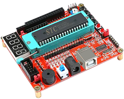 STC89C52用マイコンコアモジュール、産業用標準マイクロコントローラである80C51シリーズと完全互換の命令セットを持つ8ビットシングルチップマイクロコントローラ、USB-TTLコンバータCH340G搭載、TYPE-B USBメスコネクタ、2x5 ISPコネクタ、1x16キャラクタ液晶1602接続コネクタ、液晶輝度調整VR、1x20グラフィックス液晶128x64接続コネクタ、IRレシーバやDS18B20接続コネクタ、ブザー付き、1x8表面実装LED、4桁7セグLED表示器、1x4タクトスイッチ、リセットスイッチ、電源ジャックφ2.1/5.5、電源ON/OFFスイッチ、接続インターフェース:2.54mmピッチピンヘッダ、動作電源:3.3〜5.5V、基板寸法:90 x 76 mm、表記価格:1