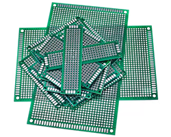 ユニバーサル基板、両面、仕上処理:ハンダ、緑色レジスタ、2.54x2.54mmピッチ、FR-4、スルーホール穴径φ1.0mm、寸法:30x70x1.6mm、表記価格:1