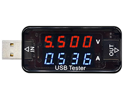 USB電圧電流計、USB電源とUSBデバイスの間に取り付けことによって充電する同時に電圧と電流が表示できます。 バッテリーや電源装置などの性能のチェックに役立ちます。4桁7セグLED表示器(x2)搭載、電圧(V)表示レンジ:3.3〜30、解析率:0.01V、電流(A)表示レンジ:0〜5A、解析率:0.01A、精度:1%、電力量(Wh)表示レンジ:0〜999、容量(Ah)表示レンジ:0〜99、回路損失:0.1Ω、入力側:TYPE-A USBオスプラグ、出力側:TYPE-A USBメスコネクタ、外形寸法(突起部含まず):62x30x15mm、表記価格:1