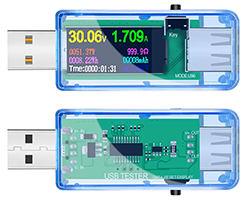 USB電圧電流計、12,800ピクセルIPSカラー液晶表示器搭載、電圧電流のほか、電力(W)、 電力量(Wh)、 容量(mAh)、温度(°C/°F)、負荷抵抗(Ω)、経過時間も表示してくれます。電圧レンジ:〜30V、電流レンジ:〜6.5A、入力側:TYPE-A USBオスプラグ、出力側:TYPE-A USBメスコネクタ、クイックチャージ機能:接続機器の充電に最適な電圧値、電流値を調節して充電できます。適合規格:QC3.0(3.8〜12V)、QC3.0(5V/9V/12V/20V)、BC1.2(5V)、アップル5V2A及びMTK-PE(5V/7V/9V/12V)、外形寸法(USBプラグ含まず):53x14x24mm、表記価格:1