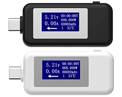 USB電圧電流計、USB電源とUSBデバイスの間に取り付けことによって充電する同時に電圧と電流が表示できます。単色液晶表示器搭載、表示領域:mm、電圧(V)表示レンジ:4〜30、電流(A)表示レンジ:0〜5.1A、 電力(W)表示レンジ:0〜155、容量(mAh)表示レンジ:0〜99999、時間カウント:0〜99時間、内部温度:0〜80°、入力側:TYPE-C USBオスプラグ、出力側:TYPE-A USBメスコネクタ、外形寸法(USBプラグ含まず):53x26x13mm、表記価格:1