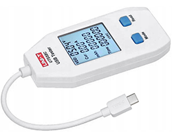 優利得(UNI-T)社製、USB電圧電流計、USB電源とUSBデバイスの間に取り付けことによって充電する同時に電圧と電流が表示できます。単色液晶表示器搭載、バックライト付き、電圧(V)表示レンジ:4〜24、電流(A)表示レンジ:0.05〜5A、、容量(mAh)表示レンジ:0〜99999、10組データ保存、過電圧・電圧付属警報、入力側:TYPE-C USBオスプラグ、出力側:TYPE-A USBメスコネクタ、外形寸法(USBケーブル含まず):84x29x12mm、表記価格:1