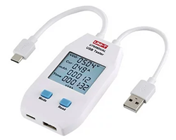 優利得(UNI-T)社製、USB電圧電流計、USB電源とUSBデバイスの間に取り付けことによって充電する同時に電圧と電流が表示できます。単色液晶表示器搭載、バックライト付き、電圧(V)表示レンジ:4〜24、電流(A)表示レンジ:0.05〜5A、、容量(mAh)表示レンジ:0〜99999、10組データ保存、過電圧・電圧付属警報、入力側:TYPE-C USBオスプラグ、出力側:TYPE-A USBメスコネクタ、外形寸法(USBケーブル含まず):84x29x12mm、表記価格:1