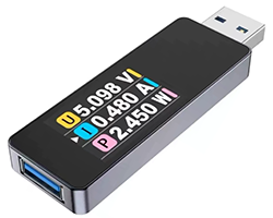 USB電圧電流計、USB電源とUSBデバイスの間に取り付けことによって充電する同時に電圧と電流が表示できます。カラー液晶表示器搭載、表示領域:mm、電圧(V)表示レンジ:4〜30、電流(A)表示レンジ:0〜3A、 電力(W)表示レンジ:0〜90、入力側:TYPE-C USBオスプラグ、出力側:TYPE-A USBメスコネクタ、10Gbps、外形寸法(USBプラグ含まず):56.5x21.4x8.3mm、表記価格:1