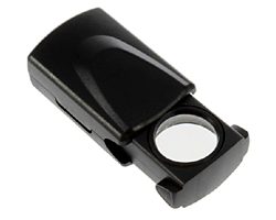 LEDライティング機能付き、収納可能なカード式拡大鏡、10倍、レンズ直径:φ21mm、動作電源:LR1130ボタン電池(x3)(付属なし)、外形寸法:54x35x23mm、表記価格:1