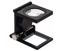 LEDライティング機能付き、収納可能なカード式拡大鏡、10倍、レンズ直径:φ21mm、動作電源:LR1130ボタン電池(x3)(付属なし)、外形寸法:54x35x23mm、表記価格:1
