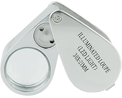 拡大鏡 、レンズ:ガラス、φ21mm、30x 、2-LED照明、動作電源:LR927ボタン電池(付属なし)、外形寸法:50x22x25mm、表記価格:1