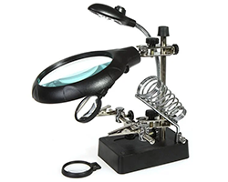 拡大鏡付き多機能作業台、LEDライト付き、はんだごてスタンド、レンズ:ガラス、φ90mm、2.5x 、LED照明、動作電源:5V、外形寸法:175x120x90mm、表記価格:1
