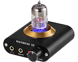 シングル球ヘッドホンアンプ、回路構成:NE5532 + 6N3、出力:1100mW@32Ω、負荷:18〜600Ω、動作電源:12V、外形寸法:90x60x75mm、表記価格:1