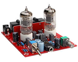 実装済み真空管プリアンプボード、回路構成:NE5532 + 6J1、適合真空管:6J1または6AK5/5654/6AU6、入力:RCAジャック、出力:電圧ゲイン0,85倍、2通り、(1)RCAジャック、(2)φ3.5オーディオジャック、動作電源:12VDC、>0.5A、電源の接続:DCジャックφ2.1/5.5、基板寸法:77 x 98.5 mm、表記価格:1