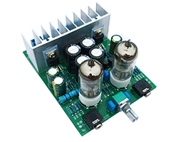 真空管・集積回路ハイブリッドパワーアンプボード、実装済み、回路構成: 6J1 + LM1875、適合真空管:6J1または6AK5/5654/6AU6、入力:φ3.5オーディオジャック、出力:MAX 20W+20W、負荷4〜8Ω、接続:2通り、(1)φ3.5オーディオジャック、(2)5.08mmピッチターミナルブロック2P+2P、動作電源:18VAC両電源、電源の接続:5.08mmピッチ3Pターミナルブロック、基板寸法:100 x 75 mm、表記価格:1
