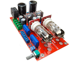 実装済み真空管プリアンプボード、回路構成:安定化電源回路 + SRPP回路6N11、適合真空管:6N11/ECC88/6DJ8/6922、入力・出力:5.08mmピッチねじ式ターミナルブロック、動作電源:150V@50mA、8V@1A、電源の接続:ねじ式ターミナルブロック、基板寸法:150 x 80 mm、表記価格:1