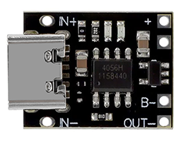 LGS4056Hを搭載したリチウムイオン電池用充電基板、 保護回路付き、チャージカットオフ電圧:4.2V ±1%、動作電源:2通り、(1)4.5〜6.5V、基板スルーホール、(2)5V、USBバスパワー、TYPE-C USBコネクタ、最大充電電流:1A、基板寸法:17.5x14mm 、表記価格: 1
