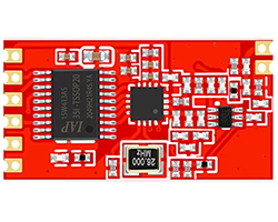 送受信一体型モジュール、GFSK、双方向データ伝送、データ伝送レート設定範囲:0.6〜38.4Kbps、通信距離の目安:1000m、動作周波数:433.92MHz、感度:-120dBm、出力:20dBm、動作電圧範囲:2.8〜3.6V、動作電流:11mA@3.3V、基板寸法:24.7x13.1mm、2.0mmピッチスルーホール、表記価格:1