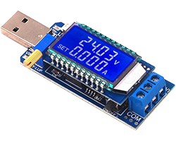 液晶表示器付き昇圧モジュール、入力電圧範囲:3.5〜12V、入力電源の接続:3通り、(1)TYPE-AオスUSBプラグ、(2)マイクロUSBコネクタ、(3)基板バッド、出力電圧範囲:1.2〜24V、出力電源の接続:5.08mmピッチ3Pターミナルブロック、基板寸法:62x28mm、表記価格:1