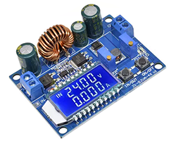 を搭載した降圧モジュール、液晶表示器付き、表示内容:入出力電圧・電流及び消費電力、入力電圧範囲:5.5〜30V、出力電圧調整範囲:0.5〜30V、出力電流調整範囲:0〜4A、入出力電源の接続:5.08mmピッチ2Pターミナルブロック、基板寸法:66x48mm、表記価格:1