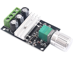 PWMモジュール、2ch出力、周波数:Hz、デューティサイクル調整範囲:0〜100%、動作電圧範囲:6〜28V、最大出力電流:3A、基板寸法:50x32mm、表記価格:1