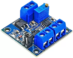 PWM/電圧コンバータモジュール、0〜100%のPWMを0〜5Vまたは0〜10V電圧にコンバートする、PWM入力周波数範囲:1K〜3KHz、動作電圧範囲:12〜30V、基板寸法:50x32mm、表記価格:1