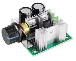 PWMモジュール、DCモータ速度コントローラ、固定周波数:13KHz、デューティサイクル調整範囲:10〜100%、動作電圧範囲:12〜40V、最大出力電流:8A、基板寸法:77x45mm、表記価格:1