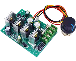 を搭載したPWMモジュール、DCモータ速度コントローラ、LED回転数表示器付き、固定周波数:15KHz、デューティサイクル調整範囲:0〜100%、動作電圧範囲:6〜60V、最大出力電流:30A、基板寸法:75x56mm、表記価格:1