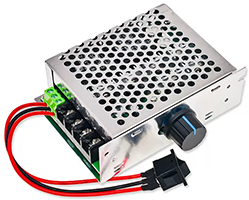 を搭載したPWMモジュール、DCモータ速度コントローラ、固定周波数:25KHz、デューティサイクル調整範囲:0〜100%、動作電圧範囲:10〜50V、最大出力電流:40A、寸法:100x76x28mm、表記価格:1
