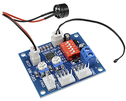 を搭載したPWMモジュール、DCモータコントローラ、デューティサイクル調整範囲:CH1:20%〜100%、40%〜100%(TFL = ON)、CH2とCH3:10%〜100%、温度制御機能付き、NTC温度センサ、温度設定:DIPスイッチ、動作電圧範囲:12V、出力電圧:12V、最大出力電流:5A、基板寸法:50x43mm、表記価格:1