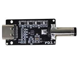 USB-PD対応電源から設定した電圧を取り出すことができるモジュール、USB-PDトリガーやUSBデコイ、シンクコントローラと呼ばれるものと同じです。PD3.1、適合:PD3.0、PD2.0、QC、FCP、AFC、電圧出力:5V/12V/20V/28V、自動切り替え、入力:TYPE-Cメスコネクタ、出力:DCプラグφ1.2/5.5mm、基板寸法:45 x 15 mm、表記価格:1
