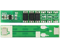 リチウムイオン電池用保護基板、1セル直列、過充電検出電圧(VCU):4.25、過充電回復電圧(VCL):4.23V、過放電検出電圧(VDL):2.45V、過放電回復電圧(VDL):V、過電流設定値:6A、基板寸法:35 x 7.6 mm、表記価格:1