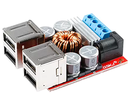 DC-DC降圧モジュール、入力:8〜35V、入力の接続:2通り、(1)DCジャック:φ2.1/5.5、(2).08mmピッチ2Pねじ式ターミナルブロック、、出力:5.2V、出力の接続:2通り、(1)TYPE-AメスUSBコネクタ(x4)、(2)5.08mmピッチ2Pねじ式ターミナルブロック、最大出力電流:10A、基板寸法:53.7 x 33.76 mm、表記価格:1