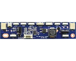 定電流出力LEDドライバー、LEDバックライト点灯用に特化した仕様、入力電圧(VCC):10〜26V、推奨:12V、ENA制御電圧:2.4〜5V@POWER ON、入力接続:2.0mmピッチ6Pコネクタ、ピンアサイン:VIN/VIN/ENA/DIM/GND/GND、出力:18〜160V、定電流、出力接続:0.5mmピッチFFCコネクタ + 1.25mmピッチ6Pコネクタ、基板寸法:120 x 30 mm、本体のみ、表記価格:1