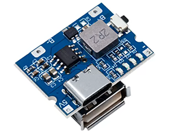 CL4056Dを搭載した充電・昇圧一体型基板、入力電圧:5V、入力電源の接続:TYPE-C USBコネクタ、出力:TYPE-Aメスコネクタ、過充電検出電圧(VCU):4.2、過充電回復電圧(VCL):V、過放電検出電圧(VDL):2.3〜3.0V、過放電回復電圧(VDL):V、過電流設定値:2.4A、、基板寸法:26 x 19 mm、表記価格:1