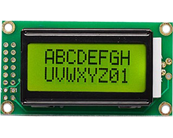 晶漢達(JHD)社製キャラクタ液晶モジュール、表示形式:TNポジティブ、文字数 x 行数:8 x 2、内蔵コントローラ:SPLC780D、1/16、表示色:黄緑色、LEDバックライト付き、表示領域(VA):37.8x16.0 mm、外形寸法:58.0x32.0x10.0 mm、データシート、表示価格:1