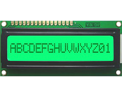 晶漢達(JHD)社製キャラクタ液晶モジュール、表示形式:ポジティブ、文字数 x 行数:16 x 1、内蔵コントローラ:SPLC780D、1/16、文字色:黄緑色、LEDバックライト:緑色、表示領域(VA):64.5x14.5 mm、外形寸法:80.0x36.0x13.5 mm、データシート、表示価格:1
