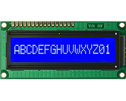 晶漢達(JHD)社製キャラクタ液晶モジュール、表示形式:ポジティブ、文字数 x 行数:16 x 1、内蔵コントローラ:SPLC780D、1/16、文字色:青色ネガティブ、LEDバックライト:白色、表示領域(VA):64.5x14.5 mm、外形寸法:80.0x36.0x13.5 mm、データシート、表示価格:1