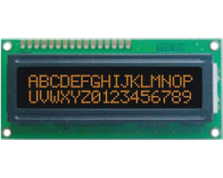 晶漢達(JHD)社製キャラクタ液晶モジュール、表示形式:FSTNネガティブ、文字数 x 行数:16 x 2、内蔵コントローラ:SPLC780D、1/16、LEDバックライト:オレンジ色、表示領域(VA):64.5x14.5 mm、外形寸法:80.0x36.0x13.5 mm、データシート、表示価格:1