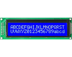 晶漢達(JHD)社製キャラクタ液晶モジュール、表示形式:FSTNネガティブ、文字数 x 行数:20 x 2、内蔵コントローラ:SPLC780D、1/16、文字表示色:白色、LEDバックライト:青色、表示領域(VA):91.6x18.6 mm、外形寸法:116.0x37.0x13.5 mm、データシート、表示価格:1