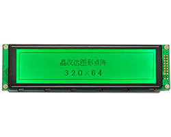 晶漢達(JHD)社製グラフィックス液晶モジュール、STN黄緑色ポジティブ、解像度:320 x 64、内蔵コントローラ:T6963C OR EQUIV、1/64、LEDバックライト:緑色、表示領域(VA):136.8x33.6 mm、外形寸法:165.0x45.0x12.0 mm、データシート、表示価格:1