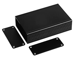 アルミ押出材ケース、端面寸法:66 x 27 mm、加工済み前後フタ・ねじ付き、色表記:S=シルバー、BK=ブラック、GD=ゴールド、R=レッド、長さ・色はバリエーションよりお選び頂けます、表記価格:1販売単位
