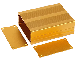 上下カバーがアルミ押出材ケース、端面寸法:76 x 35 mm、加工済み前後フタ・ねじ付き、色表記:S=シルバー、BK=ブラック、GD=ゴールド、R=レッド、B=ブルー、長さ・色はバリエーションよりお選び頂けます、表記価格:1販売単位