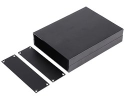 上下カバーがアルミ押出材ケース、端面寸法:114.4 x 32.8 mm、加工済み前後フタ・ねじ付き、色表記:S=シルバー、BK=ブラック、GD=ゴールド、R=レッド、長さ・色はバリエーションよりお選び頂けます、表記価格:1販売単位