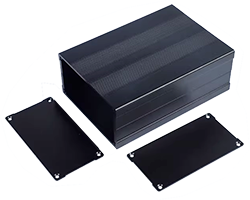 アルミ押出材ケース、端面寸法:106 x 55 mm、加工済み前後フタ・ねじ付き、色表記:S=シルバー、BK=ブラック、GD=ゴールド、R=レッド、長さ・色はバリエーションよりお選び頂けます、表記価格:1販売単位