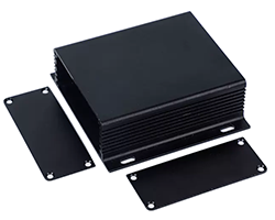 アルミ押出材ケース、端面寸法:104.4 x 28.3 mm、加工済み前後フタ・ねじ付き、色表記:S=シルバー、BK=ブラック、GD=ゴールド、R=レッド、長さ・色はバリエーションよりお選び頂けます、表記価格:1販売単位